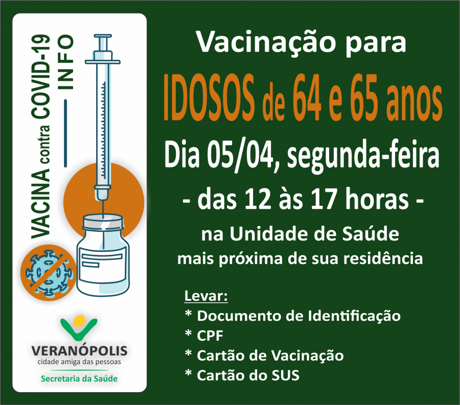 A Secretaria Municipal da Saúde informa que continua a campanha de vacinação contra Covid-19 em Veranópolis. Na segunda-feira, dia 05 de abril, estará disponível a primeira dose da vacina para os idosos de 64 e 65 anos, e possíveis longevos com mais de 66 anos que ainda não se vacinaram. Os idosos deverão se dirigir ao seu Posto de Saúde de referência para receber as vacinas, na terça-feira, no horário das 12h às 17h (período da tarde). Para a vacinação é necessário apresentar os seguintes documentos: · Carteira de Vacinação; · Documento de identificação e CPF; · Cartão do SUS. A Secretaria da Saúde solicita aos idosos a serem vacinados na segunda-feira que se desloquem às unidades de saúde com tranquilidade ao longo do período da tarde, a fim de evitar aglomerações, pois haverá vacinas para todos. Importante observar o seguinte: As pessoas que irão se vacinar e tiveram resultado positivo para Covid-19, deverão aguardar 30 dias para a realização da vacina. E quem estiver com sintomas de COVID-19, deverá procurar atendimento médico para elucidar o diagnóstico antes de realizar a vacina.