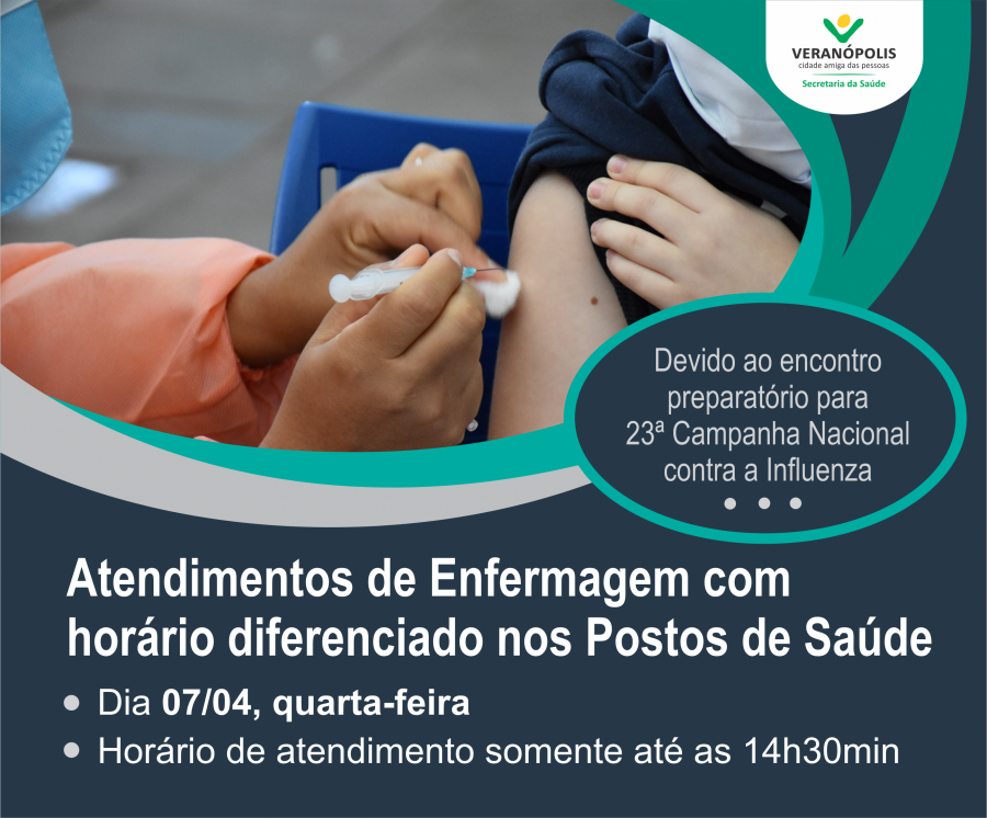A Secretaria da Saúde de Veranópolis informa que nesta quarta-feira, dia 07 de abril, no horário das 15 às 17h, as equipes de enfermagem da atenção básica do município estarão participando de um Encontro Preparatório para a 23º Campanha Nacional contra a Influenza. Por esse motivo não haverá atendimentos de enfermagem, como: realização de curativos, aplicação de vacinas e medicamentos, em todos os postos de saúde de Veranópolis nesta quarta-feira, a partir das 14h30min. Solicita-se aos que necessitam desses serviços de saúde que procurem as unidades com antecedência, no período da manhã ou até as 14h30min, para que sejam atendidos.