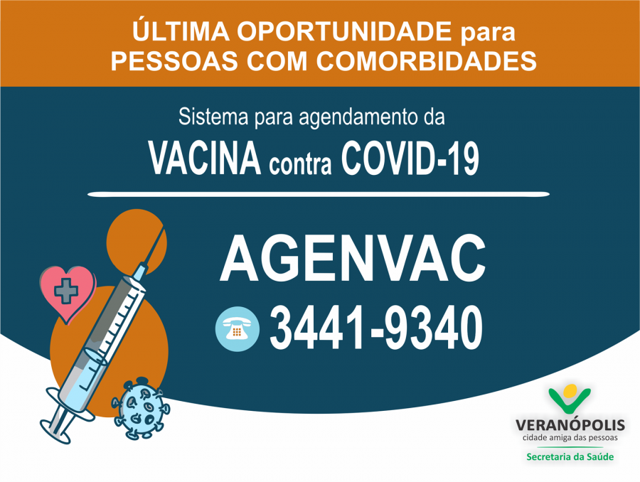 Próxima terça-feira, será aúltima oportunidade para pessoas com comorbidades realizarem a Vacinação contra a Covid-19 em Veranópolis. Agendamento já pode ser feito pelo AGENVAC = (54) 3441-9340. A vacinação contra a COVID-19 está disponível para as seguintes comorbidades:Diabetes Mellitus – Obrigatório a apresentação de receita médica dos medicamentos; Hipertensão em todos os níveis e outros problemas cardíacos – Obrigatório a apresentação de receita médica dos medicamentos; Asma em uso contínuo de corticóide - Obrigatório apresentar a receita médica; Obesidade Mórbida (IMC maior ou igual a 40); Doença de Chron – Obrigatório a apresentação de comprovação da doença; Lupus Eritematoso Sistêmico - Obrigatório a apresentação de comprovação da doença; Pacientes oncológicos em tratamento quimioterápico ou radioterápico; Imunossupressão – Apresentar receita ou laudo médico comprovando a situação; Pessoas com deficiência permanente (PCD). A vacinação para esse público será realizada em todos os Postos de Saúde do município na próxima terça-feira, dia 08 de junho, no período da tarde, e já por ser agendada pelo AGENVAC = telefone (54) 3441-9340. É importante destacar que a vacinação é para as pessoas que tenham acima de 18 anos e se enquadram nas comorbidades. No dia da Vacinação é necessário apresentar documento de identificação, CPF, Cartão de Vacinação, Cartão do SUS e atestado para a comorbidade ou deficiência, sendo que em alguns casos as deficiências podem ser auto-declaradas.