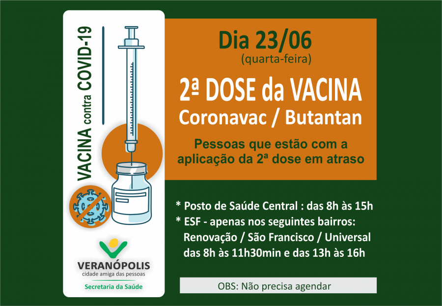 A Secretaria da Saúde de Veranópolis informa que nesta quarta-feira, dia 23 de junho, estará disponível a 2ª dose do imunizante contra a Covid-19 - CORONAVAC, do laboratório Butantan, para as pessoas que estão aguardando por um bom tempo completar seu esquema vacinal. No dia 23 de junho, quarta-feira, a 2ª dose da vacina contra a Covid - CORONAVAC, estará disponível nos seguintes Postos de Saúde, no horário 8h às 11h30min e das 13h às 16h: ESF Renovação / ESF São Francisco / UBS Universal. E no Posto de Saúde Central no horário das 8h às 15h. Não precisa realizar agendamento. Lembre-se de levar junto um documento de identificação e o cartão de vacinação.