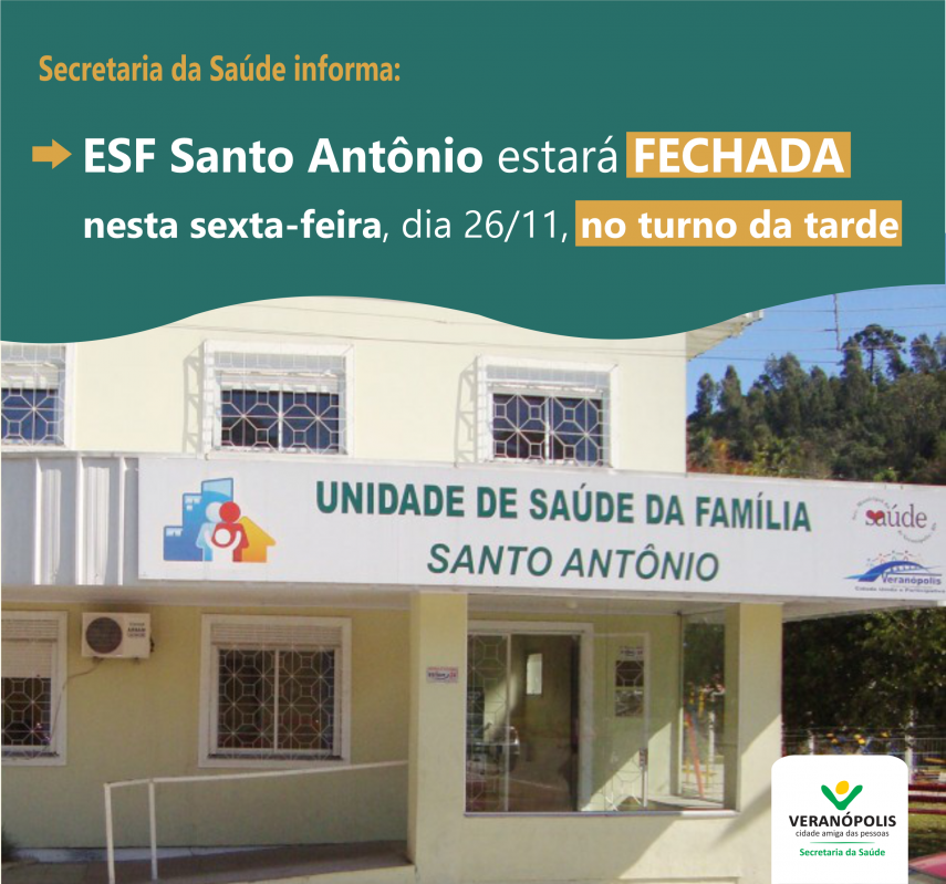 A Secretaria Municipal da Saúde informa que na tarde desta sexta-feira, dia 26 de novembro, a ESF do Bairro Santo Antônio estará fechada devido a capacitações da equipe junto ao Estado. Por isso, solicita-se a compreensão dos usuários. Caso precisar de atendimento, busque a unidade de saúde no período da manhã.