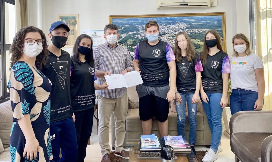 O Prefeito Waldemar De Carli, recebeu em seu gabinete na manhã da sexta-feira, dia 10 de dezembro, alunos, professoras e direção da Escola Municipal de Ensino Fundamental Irmão Artur Francisco, para a entrega oficial do convite de formatura das turmas do 9º ano. O evento de conclusão do Ensino Fundamental irá acontecer no domingo, dia 19 de dezembro, na Casa da Cultura Frei Rovílio Costa. Foto: Jéssica Resteli