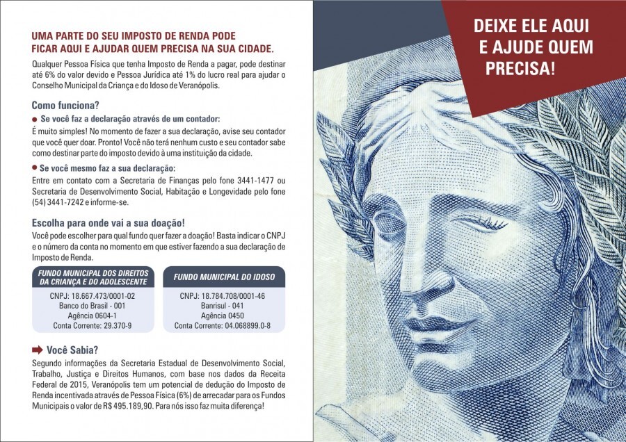Por meio do Imposto de Renda, pessoas físicas e jurídicas podem contribuir para o desenvolvimento de entidades e projetos ligados ao Fundo Municipal do Idoso ou ao Comdica - Fundo dos Direitos da Criança e do Adolescente de Veranópolis. Qualquer pessoa física que tenha Imposto de Renda a pagar, pode destinar até 6% do valor devido e Pessoa jurídica até 1% do lucro real para esses fundos municipais. Como funciona? Se você fizer a declaração por meio de um contador, basta informar a ele que você deseja doar e ele irá realizar o procedimento necessário. Se você mesmo realizar a sua declaração de IR, pode entrar em contato com a Secretaria de Finanças, através do fone 3441-1477 ou com a Secretaria de Desenvolvimento Social, Habitação e Longevidade, pelo fone 3441-7242, e obter mais informações a respeito. A pessoa que faz a doação pode escolher qual fundo deseja destinar a verba, indicando o CNPJ e o número da conta bancária do mesmo, no momento em que estiver fazendo a declaração. Os valores doados, dentro das porcentagens específicas, serão abatidos do valor a pagar do Imposto de Renda.