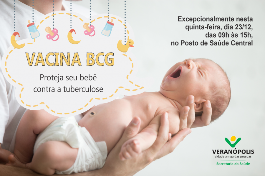 A Secretaria Municipal da Saúde informa que, excepcionalmente nesta semana, a vacina BCG será realizada no Posto de Saúde Central no dia 23 de dezembro, quinta-feira, das 09h às 15h, em função do feriado de Natal. Essa vacina protege contra as formas graves da tuberculose, miliar e meníngea, doença contagiosa provocada por bactéria que não atinge apenas os pulmões, mas também os ossos, rins e meninges (membranas que envolvem o cérebro). É obrigatória a administração da BCG em crianças recém nascidas, no máximo até os 30 primeiros dias do nascimento do bebê. Porém, quanto antes for realizada, melhor é.