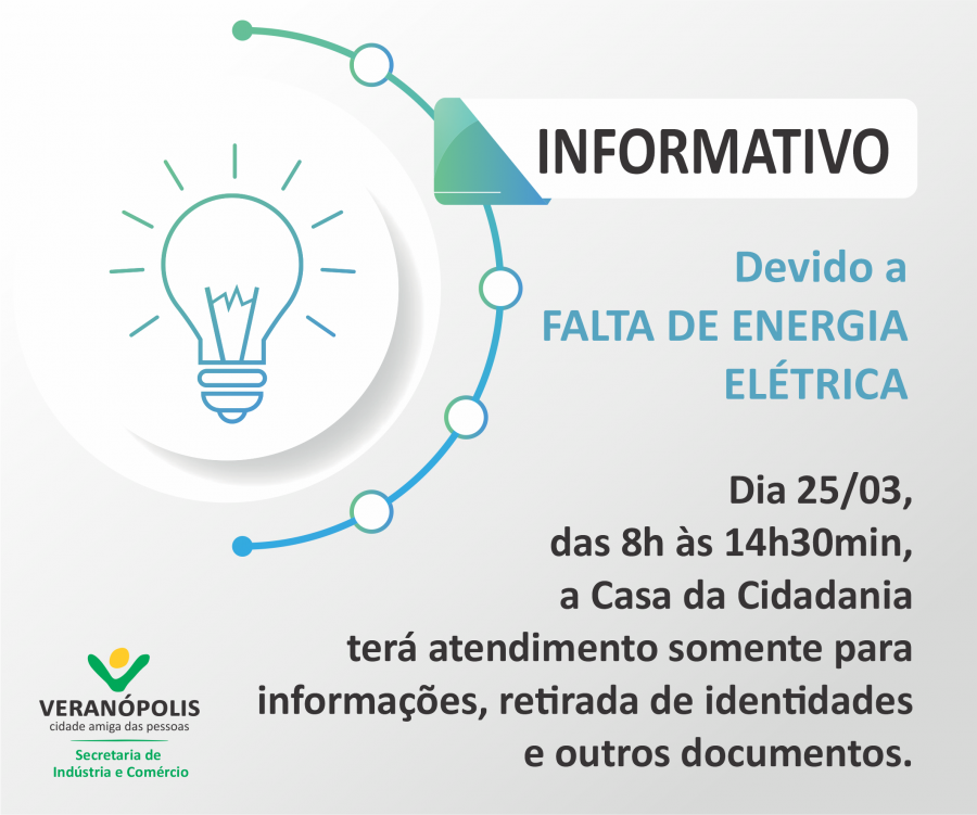 A Secretaria de Indústria e Comércio informa que nesta sexta-feira, dia 25 de março, haverá falta de energia das 8h às 14h30. O motivo é a realização de obras para manutenção e melhoria da qualidade da energia recebida pelos consumidores. Nesse período, na Casa da Cidadania, haverá atendimentos somente para informações e retirada de identidades e outros documentos.