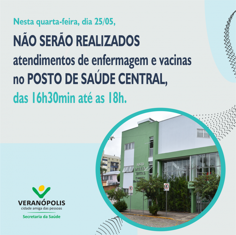 A Secretaria da Saúde de Veranópolis informa que amanhã, dia 25 de maio, das 16h30min até as 18h, haverá uma reunião de enfermagem. Portanto, neste momento não serão realizados atendimentos de enfermagem e nem de vacinas no Posto de Saúde Central.