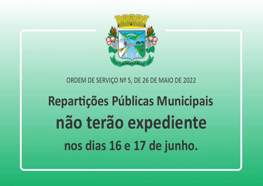 A Prefeitura de Veranópolis, por meio da Ordem de Serviço nº 5, de 26 de maio de 2022, que dispõe sobre o expediente dos órgãos públicos municipais considerando o Feriado de Corpus Christi, no dia 16 de junho, determina que não haverá expediente nas Repartições Públicas Municipais no dia 17 de junho, sexta-feira. O disposto não se aplica ao serviço de vigilância. Os motoristas de ambulância ficam de sobreaviso na data referida. Na Unidade Sanitária Central poderá haver expediente das 8h às 14h, nos dias 16 e 17 de junho de 2022, por determinação da Secretaria Municipal da Saúde, se for constatada a necessidade. em Confira a Ordem de Serviço na íntegra disponível abaixo./em