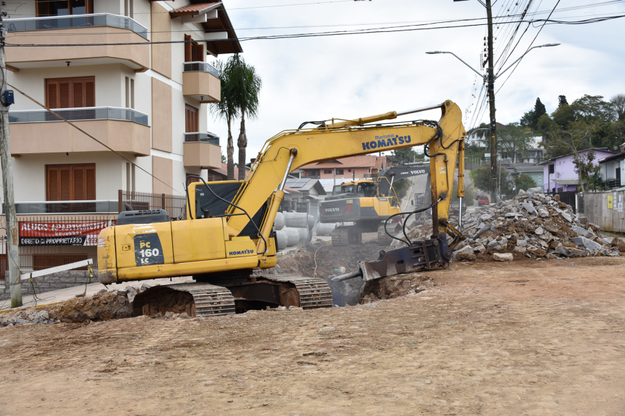 Os trabalhos de realização da galeria de escoamento pluvial e de esgoto localizada na Rua Flores da Cunha, no bairro Femaçã, seguem sendo realizados. Nesta semana, continua sendo realizada a detonação de pedras para seguir com a obra e a colocação dos tubos. Serão instalados 260 metros de tubulação que irá realizar o desvio da atual rede que passa entre as residências, para a nova rede que está sendo realizada na rua. em Foto: Caroline Cesca/em