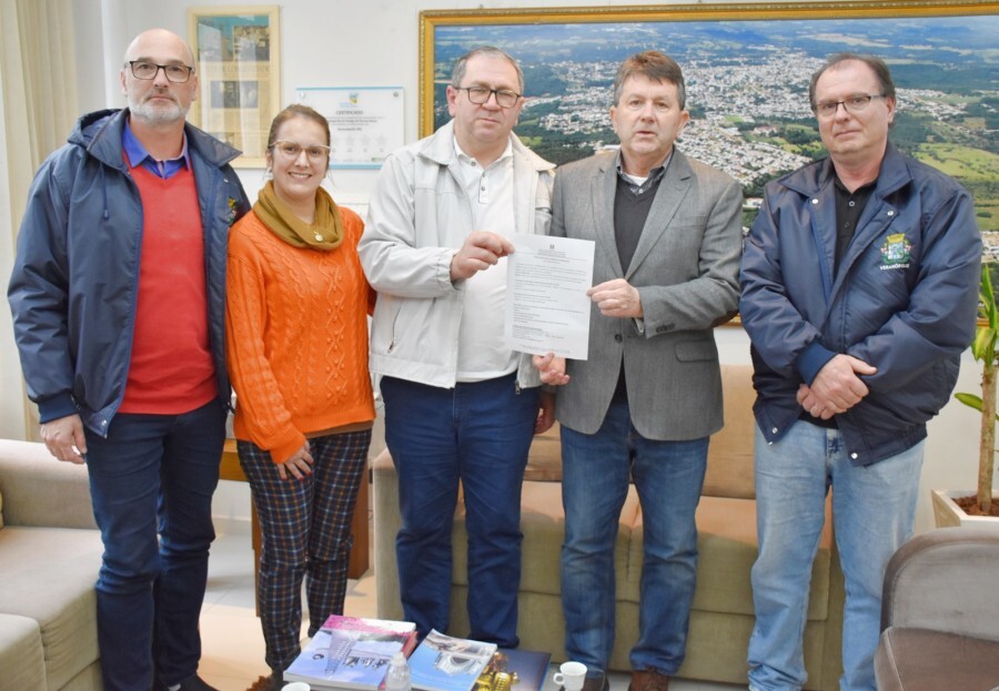 Nesta terça-feira, dia 19 de julho, o Prefeito de Veranópolis, Waldemar De Carli, recebeu em seu gabinete o Assessor do Deputado Estadual Dirceu Franciscon, Jair Nascimento, acompanhado pelos Secretários Municipais, Fernando Fracaro e Daiane Ambrosini Domeneghini, e pelo presidente do PTB, Lari Marin. Oportunidade onde foi entregue ao Prefeito documento de habilitação para cedência de máquina do Governo do Estado do Rio Grande do Sul. Onde, por meio de envio de documentos, o município de Veranópolis precisará se habilitar para receber uma Escavadeira Hidráulica. Cedência que estará sendo realizada pela Secretaria Estadual de Obras e Habitação, por meio do Secretário Volnei Minozzo, ato que também contou com o apoio do Deputado Estadual Dirceu Fraciscon. Máquina destinada a Terra da Longevidade pelo Governo do RS para contribuir na recuperação e manutenção de estradas vicinais e no desassoreamento de cursos de água. Foto: Leticia Fracasso