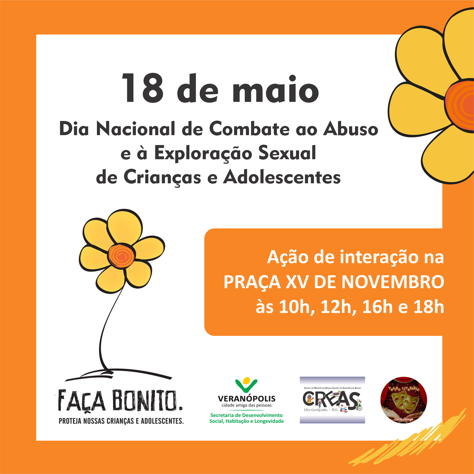 O dia 18 de maio é o Dia Nacional de combate ao abuso e à exploração sexual de crianças e adolescentes. Essa é uma data de luta, conscientização e mobilização de toda a sociedade em prol dos direitos humanos e contra a violência sexual de meninos e meninas no nosso município e em todo país.