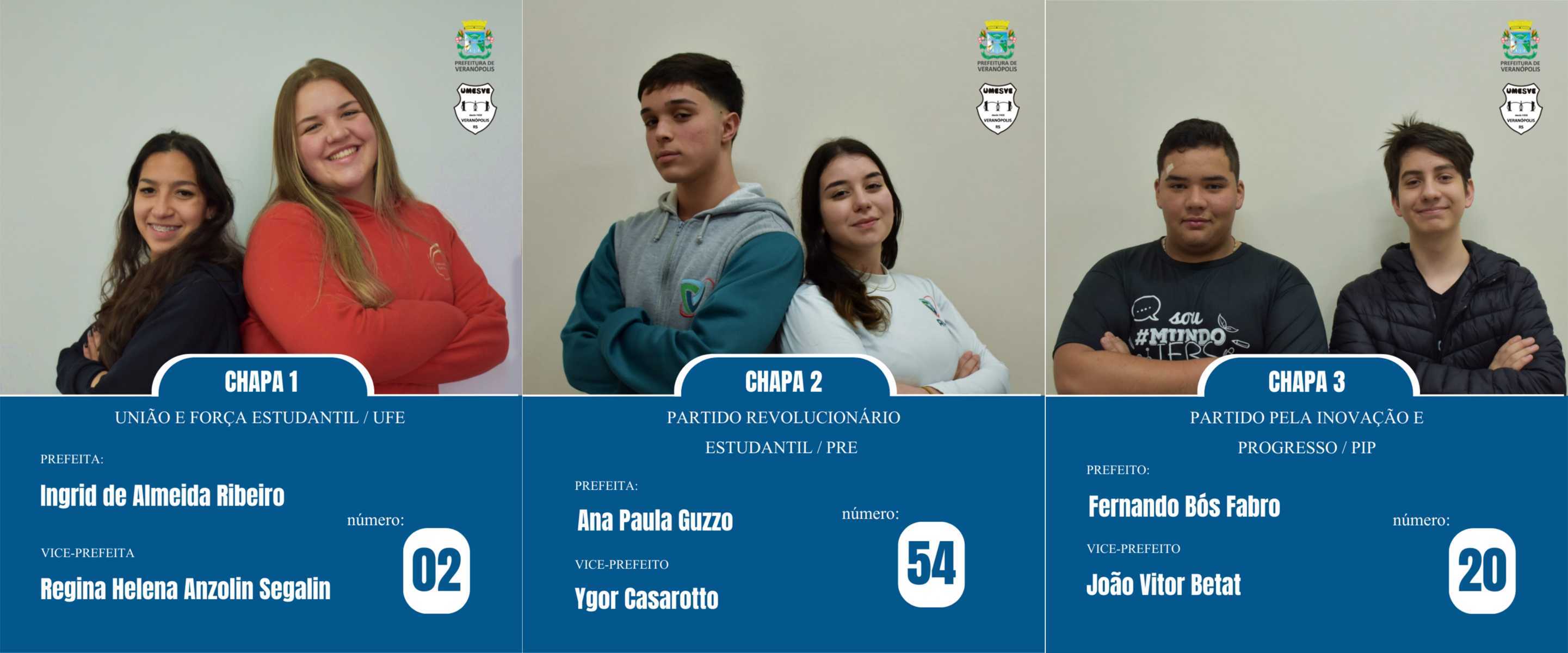 A Secretaria Municipal de Educação, Esportes, Lazer e Juventude, juntamente com a Umesve, divulga as chapas e seus candidatos que fazem estão concorrendo nesta eleição estudantil.
