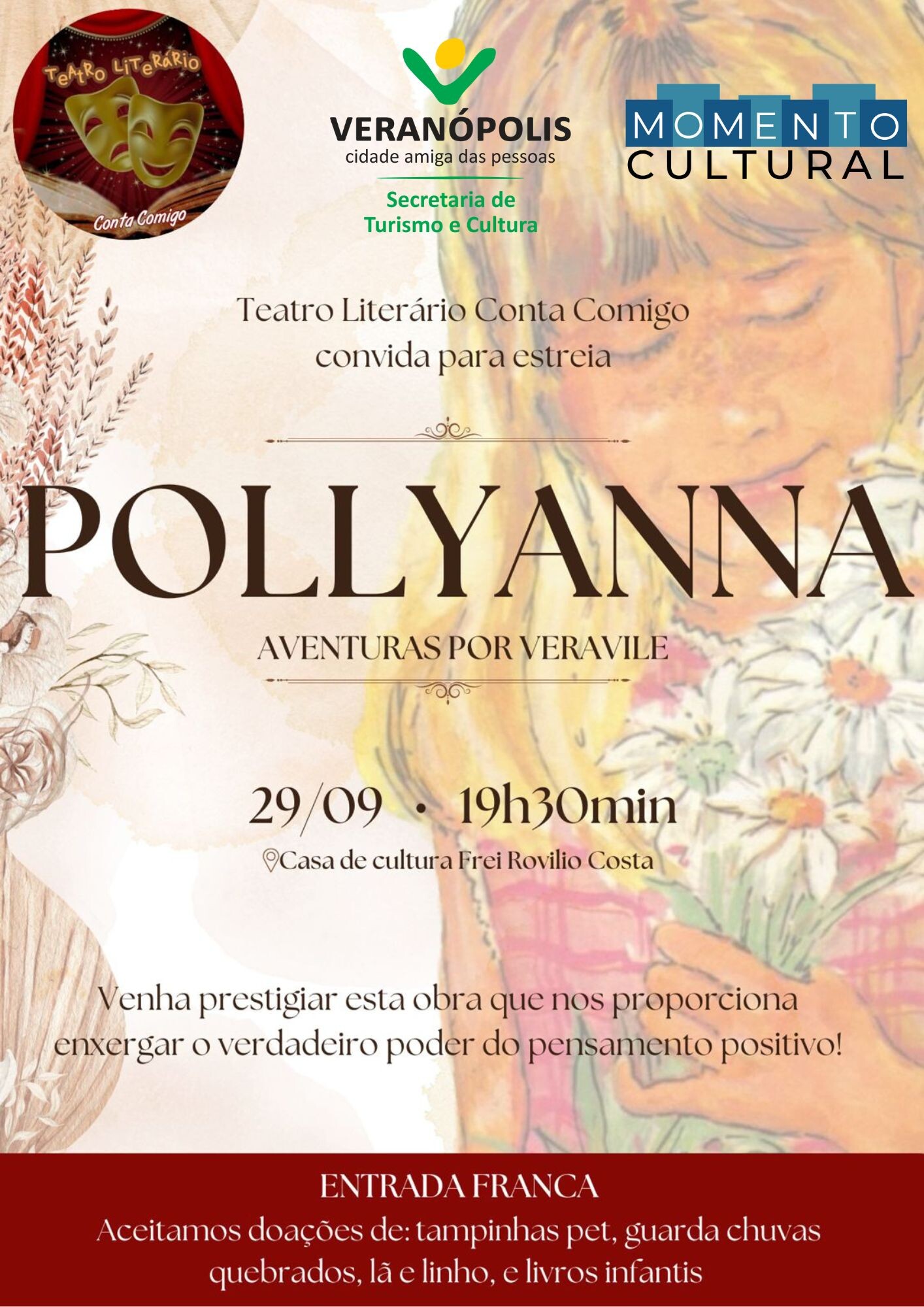 A Prefeitura de Veranópolis, por meio da Secretaria Turismo e Cultura convida a comunidade veranense para prestigiar o Momento Cultural do mês de Setembro que irá apresentar o espetáculo teatral infantil “Pollyanna – Aventuras por Veravile”, que estreia nesta sexta-feira, dia 29 de setembro, na Casa Casa da Cultura Frei Rovílio Costa, às 19h30min.