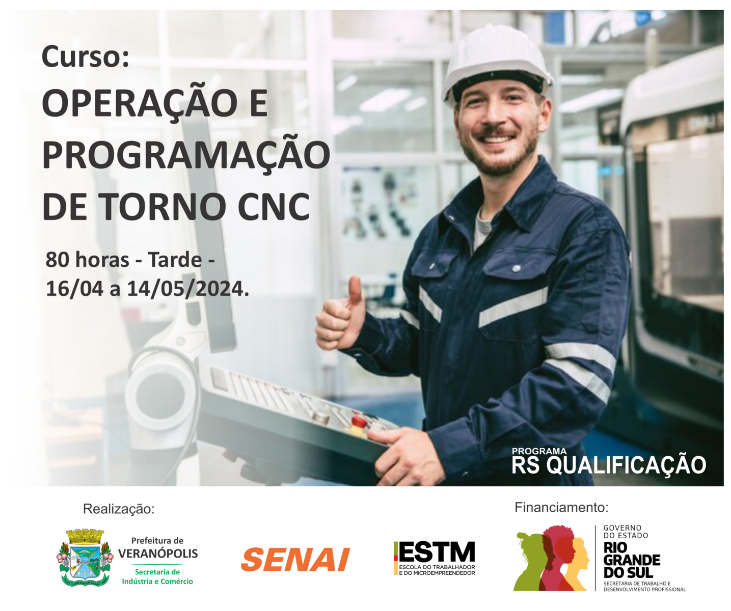 A Secretaria de Indústria e Comércio de Veranópolis, inicia no mês de abril o curso de Operação e Programação de Torno CNC que faz parte dos cursos profissionalizantes que estão sendo disponibilizados de forma gratuita, por meio do Programa RS Qualificação.
