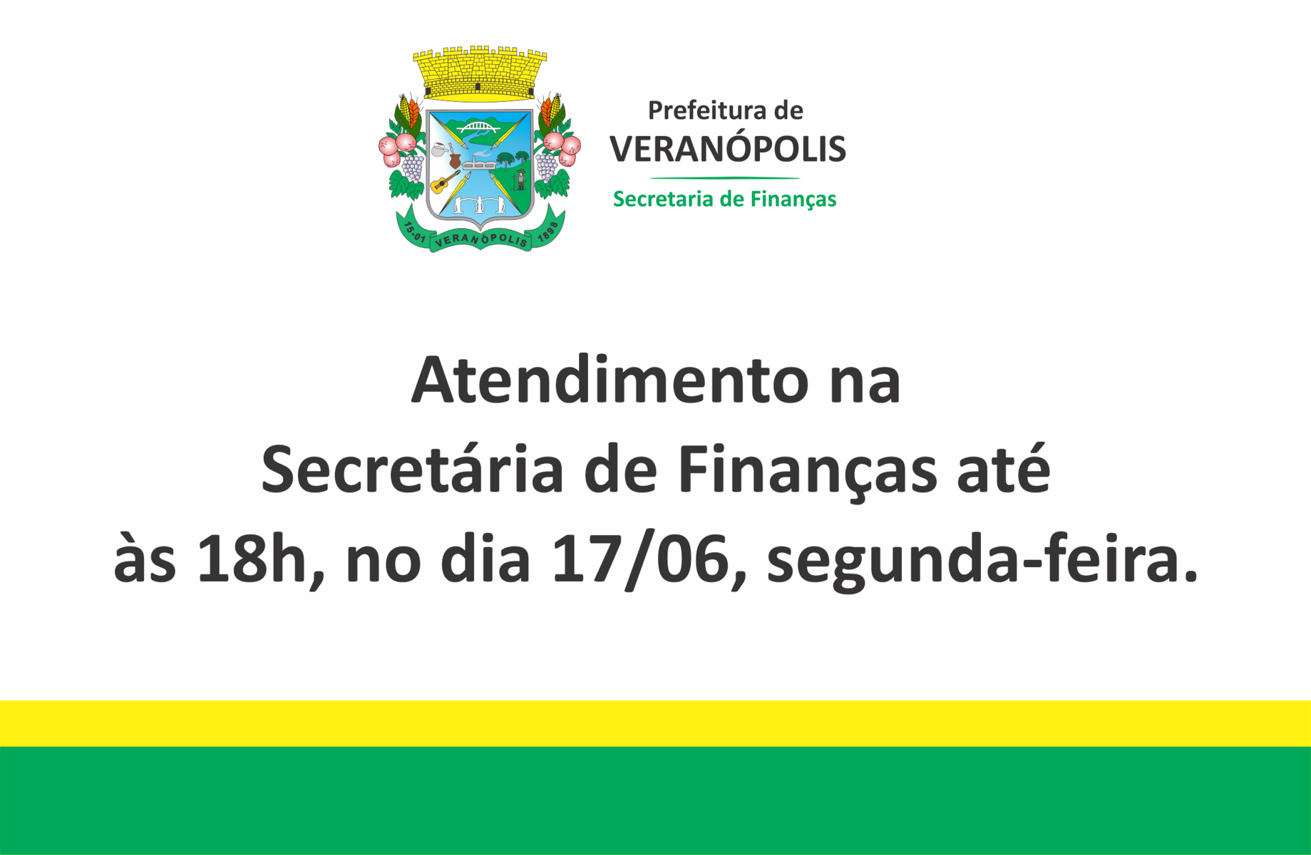 Secretaria de Finanças de Veranópolis informa que o atendimento nesta segunda-feira, dia 17 de junho acontece até as 18 horas.