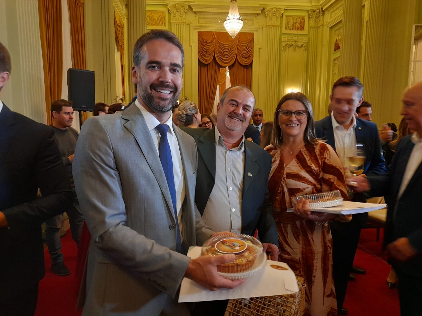 O governador do Rio Grande do Sul, Eduardo Leite, recebeu na noite da última segunda-feira, dia 28, o convite oficial para participar da La Cucagna, tradicional festa italiana que será realizada em Veranópolis. O convite foi entregue pela diretora de Cultura do município, Diana Alessio, e pelo vereador Clovis Simioni, durante um encontro no Palácio Piratini. Na ocasião, o governador agradeceu o convite e demonstrou interesse pela festividade.