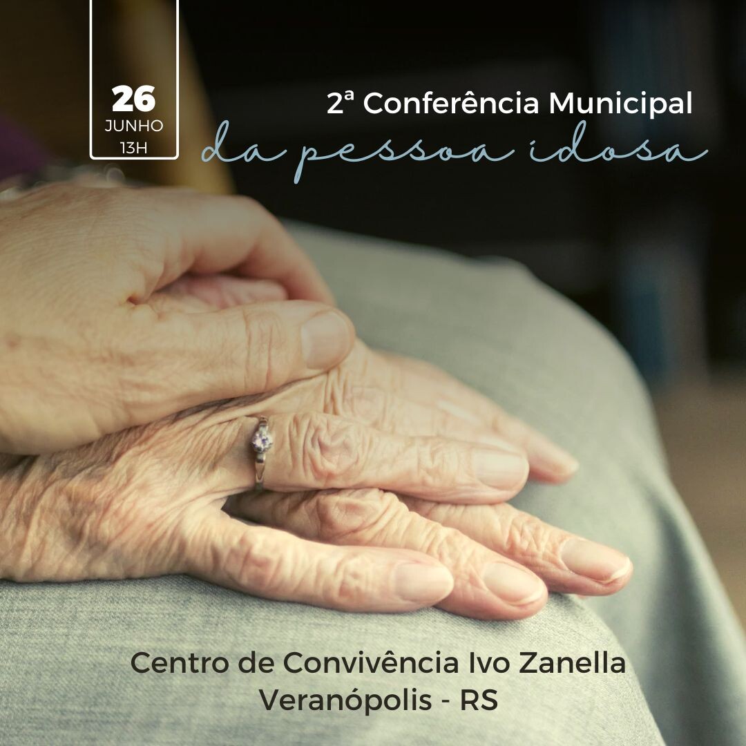 O Conselho Municipal da Pessoa Idosa, em parceria com a Secretaria de Desenvolvimento Social, promove nesta quinta-feira, dia 26 de junho, a 2ª Conferência Municipal dos Direitos da Pessoa Idosa. O evento será realizado no Centro de Convivência Ivo Zanella, a partir das 13h, e é aberto à participação de toda a população.