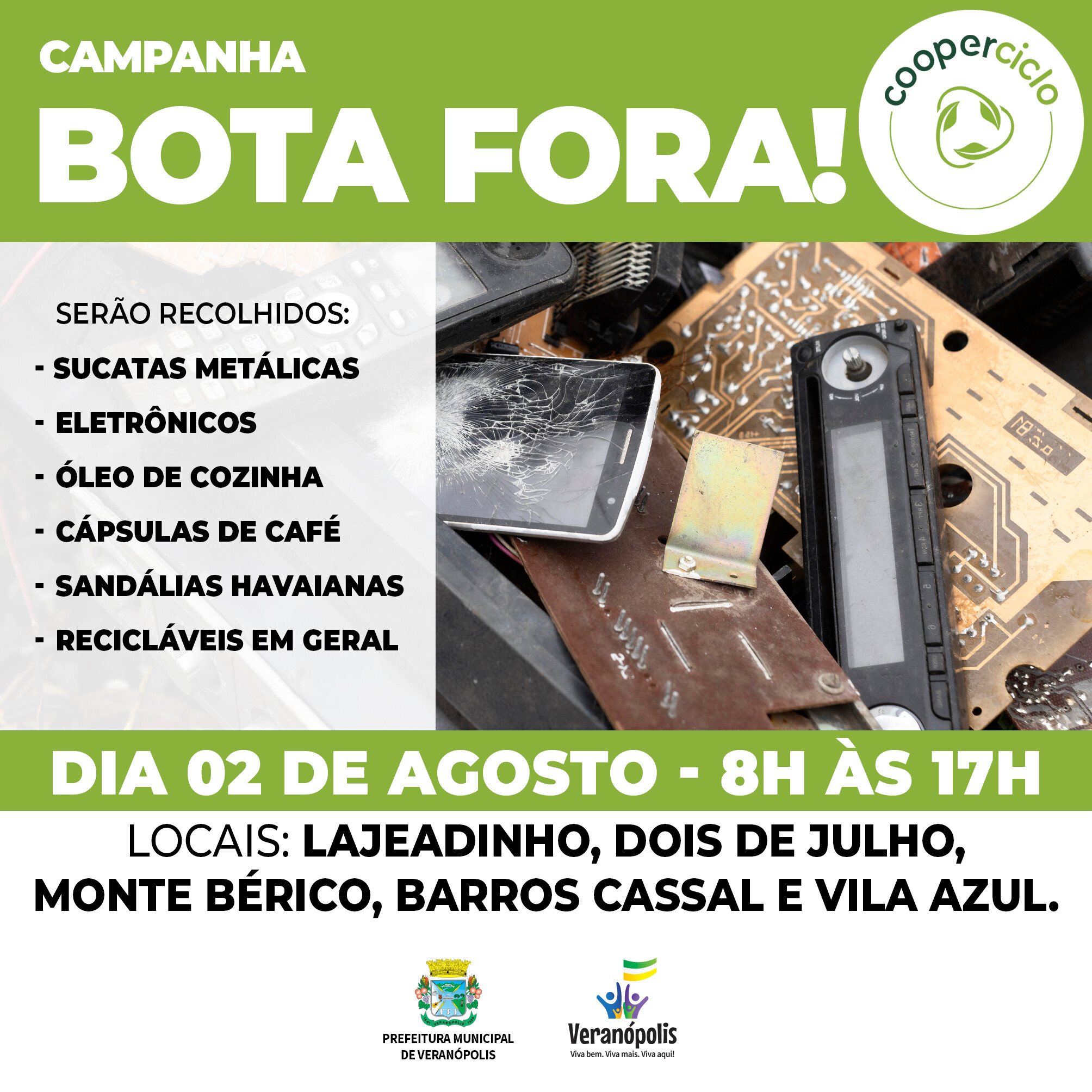 Acontece no dia 02 de agosto (sábado) mais uma edição da Campanha Bota Fora, promovida pela Prefeitura de Veranópolis, em parceria com a Cooperativa Cooperciclo. A ação tem como objetivo incentivar o descarte correto de materiais recicláveis, contribuindo para a preservação ambiental e a limpeza das comunidades atendidas.