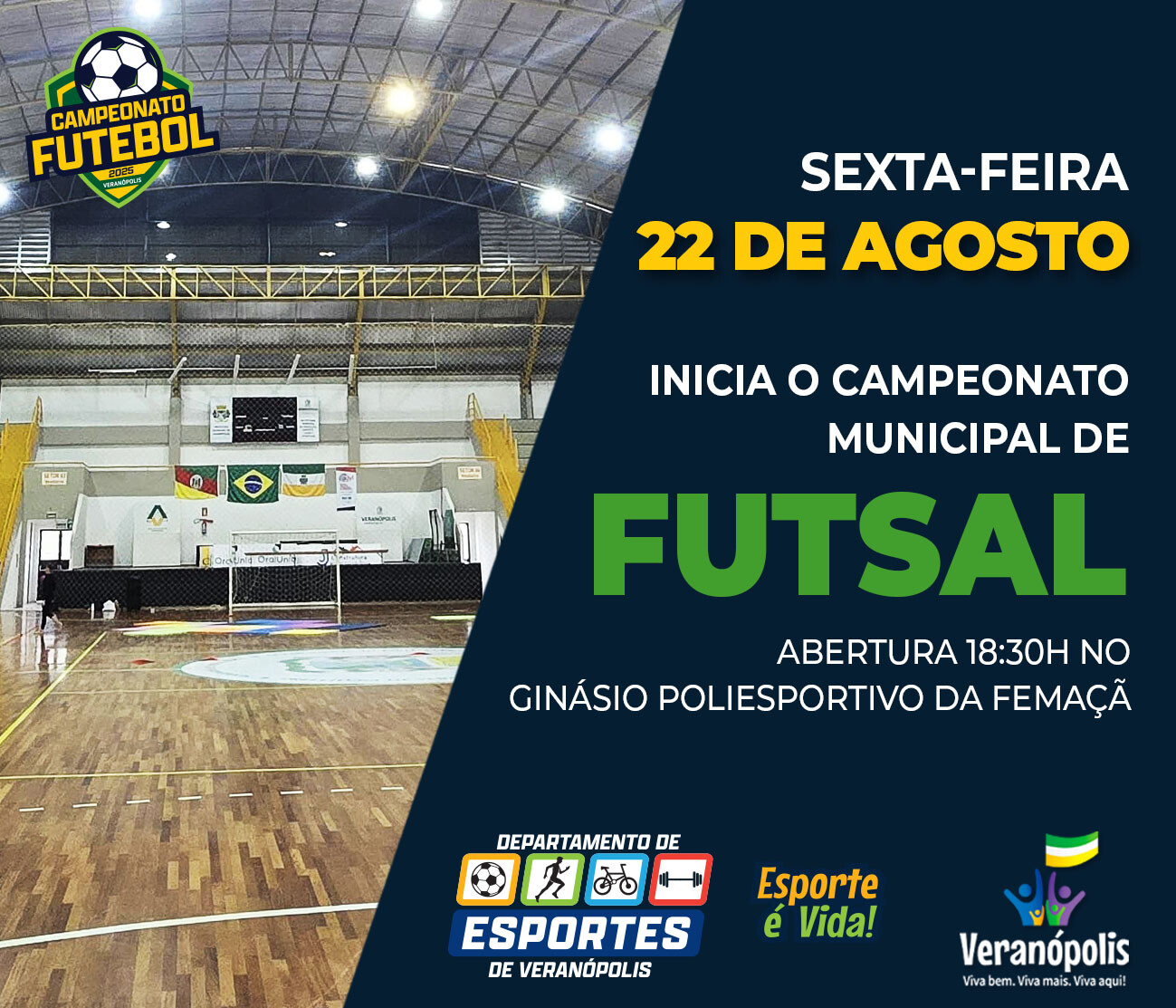 A Secretaria de Educação, Cultura e Esportes convida a comunidade veranense para prestigiar a abertura do Campeonato Municipal de Futsal, que inicia nesta sexta-feira, dia 22, no Ginásio Poliesportivo da Femaçã. A rodada inaugural já começa com grandes jogos, reunindo atletas de diferentes faixas etárias e promovendo integração, espírito esportivo e valorização do nosso futsal.