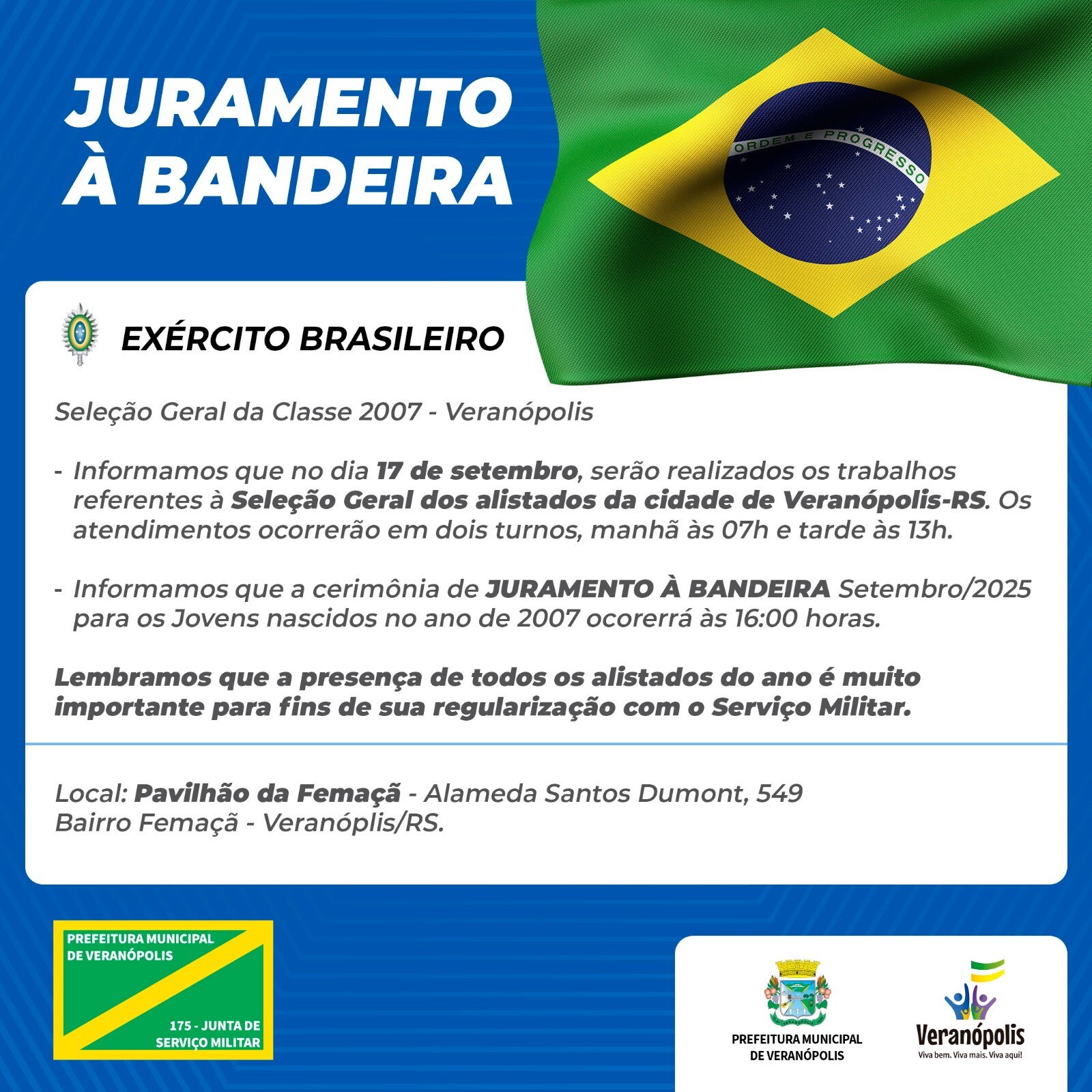Na próxima quarta-feira, 17 de setembro, acontece em Veranópolis a Seleção Geral da Classe 2007, destinada aos jovens alistados no Serviço Militar.