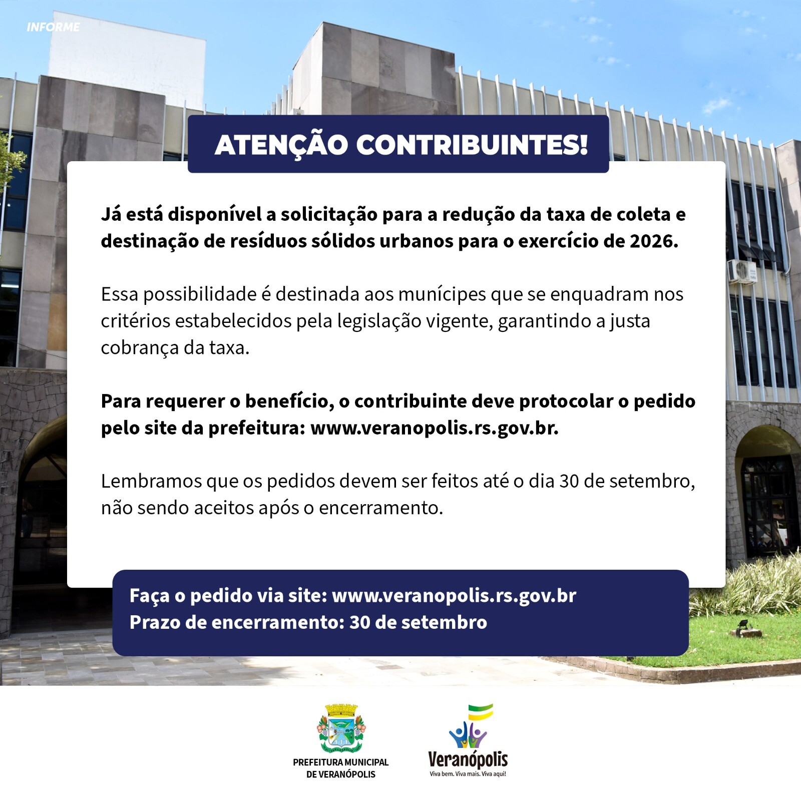A Prefeitura de Veranópolis informa que os contribuintes que realizam, por conta própria, a coleta e a destinação adequada de resíduos sólidos industriais ou hospitalares podem solicitar a redução da área individual taxada para fins de cálculo da taxa de coleta de lixo.