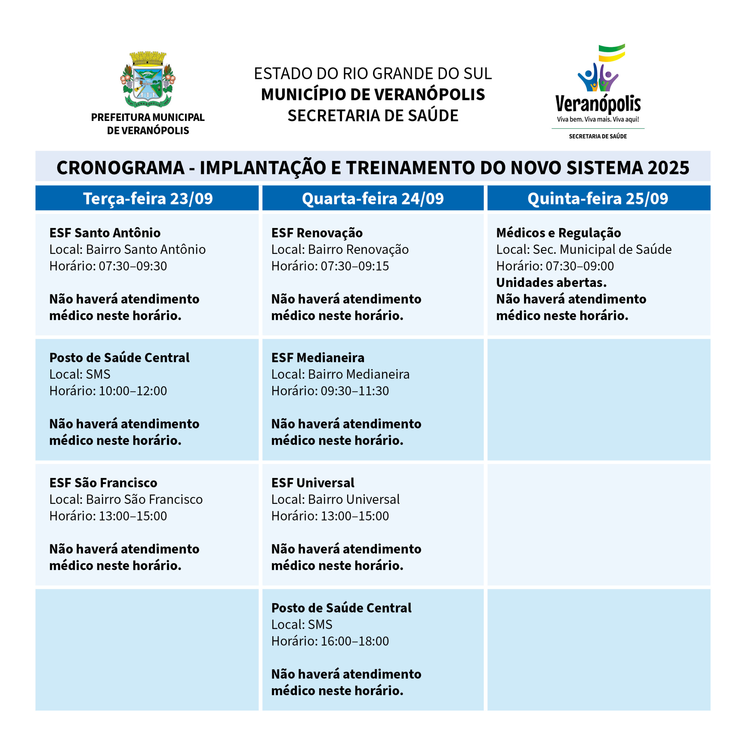 A Prefeitura Municipal de Veranópolis, por meio da Secretaria de Saúde, informa à comunidade o cronograma de implantação e treinamento do novo sistema de saúde, que ocorrerá entre os dias 23 e 25 de setembro.